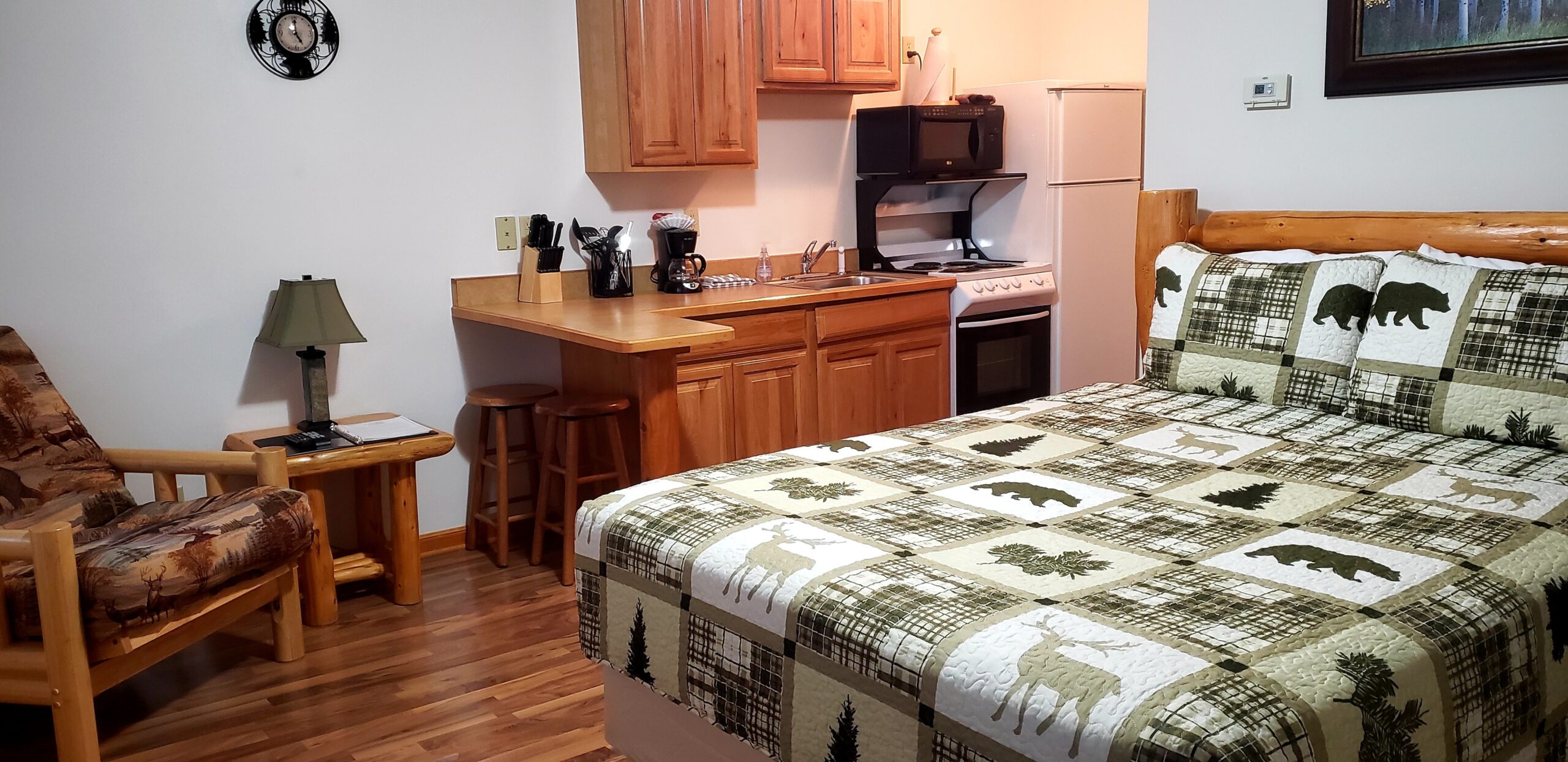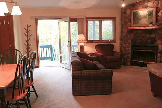 Suite includes a fully equipped kitchen, dining area, living room with fireplace, and queen sofa sleeper; one bedroom with a king or queen size bed. One bath with single whirlpool tub plus washer and dryer. (A couple of units have a walk-in shower instead; please call if you have a specific request.)