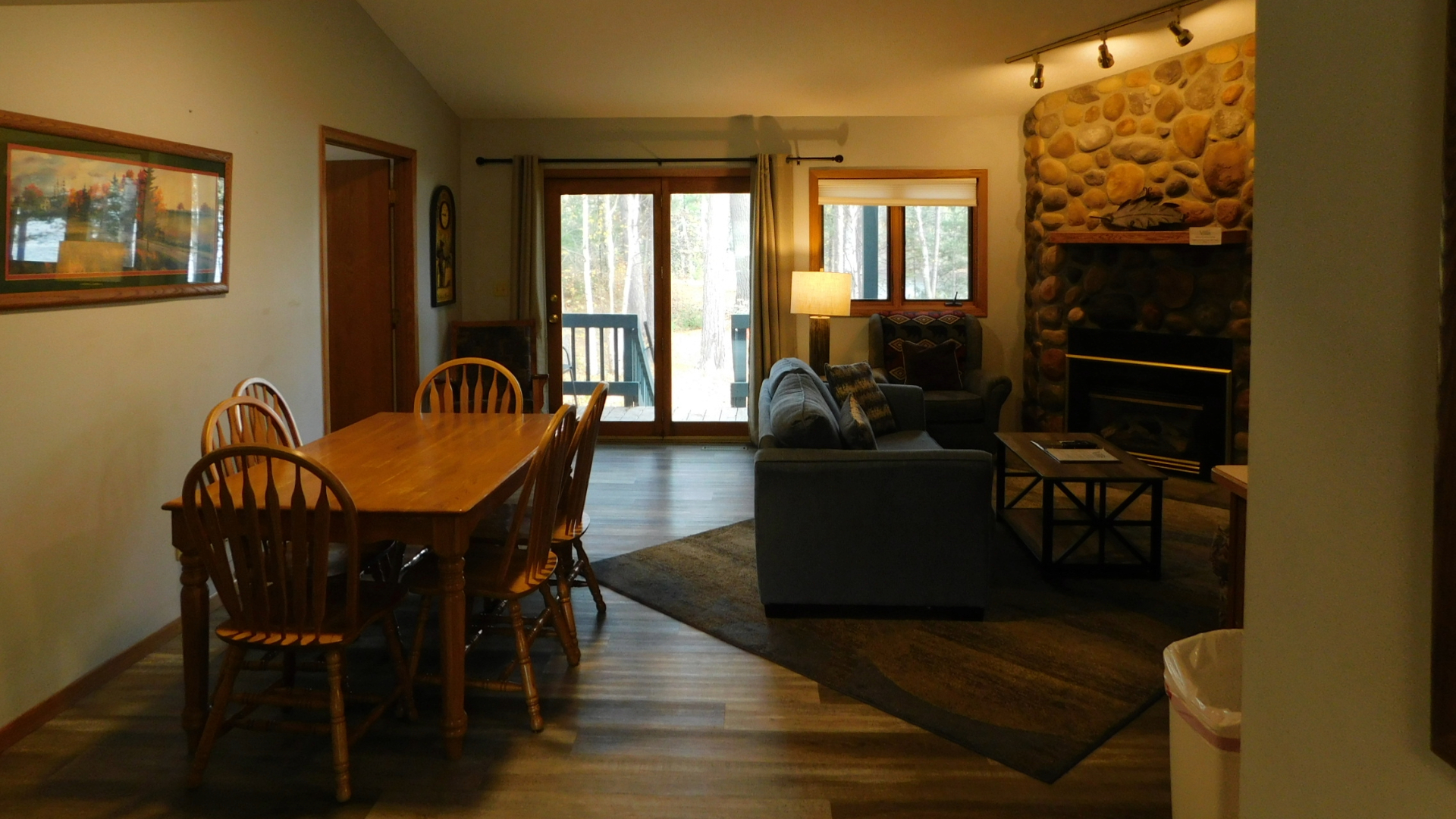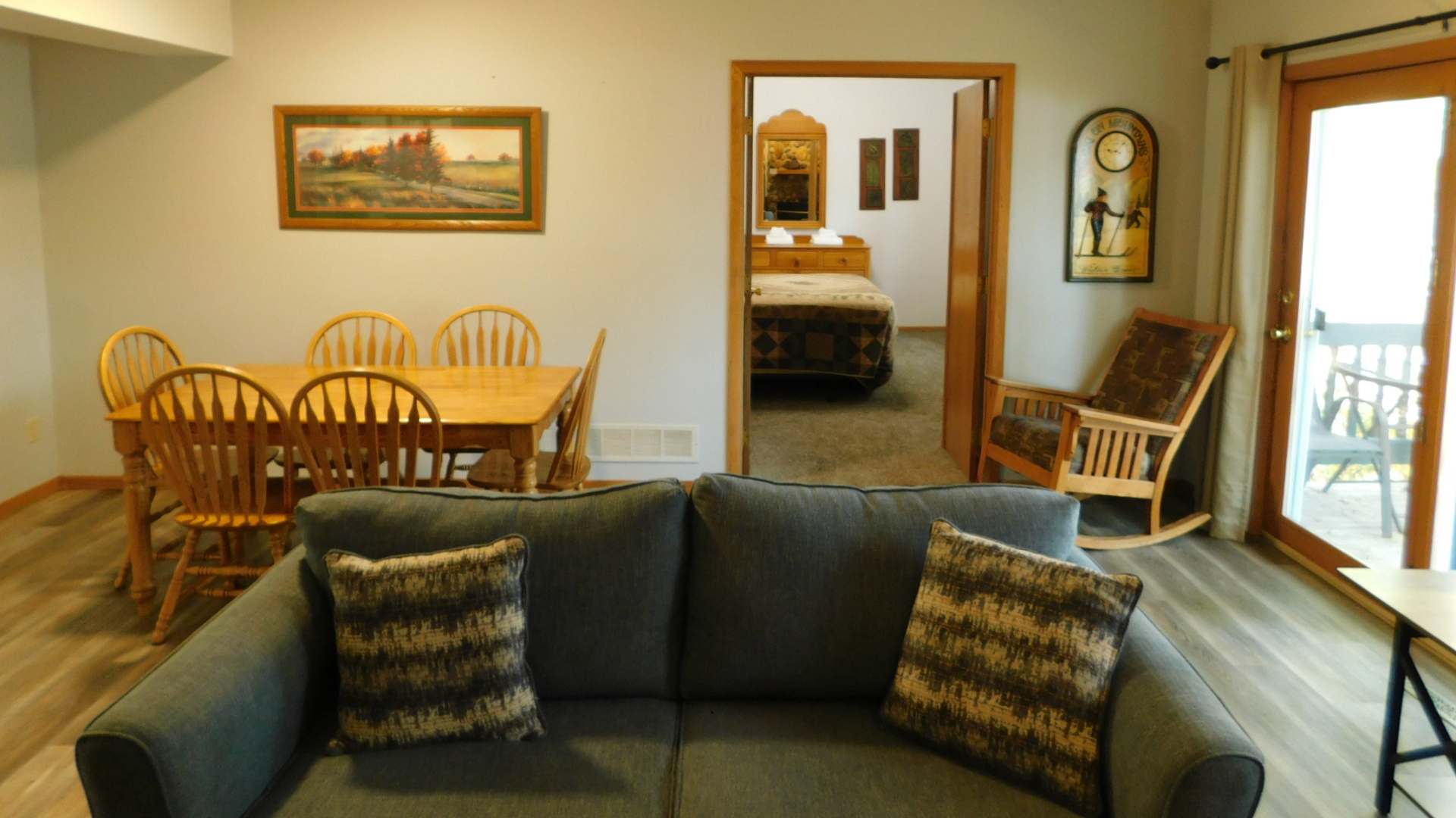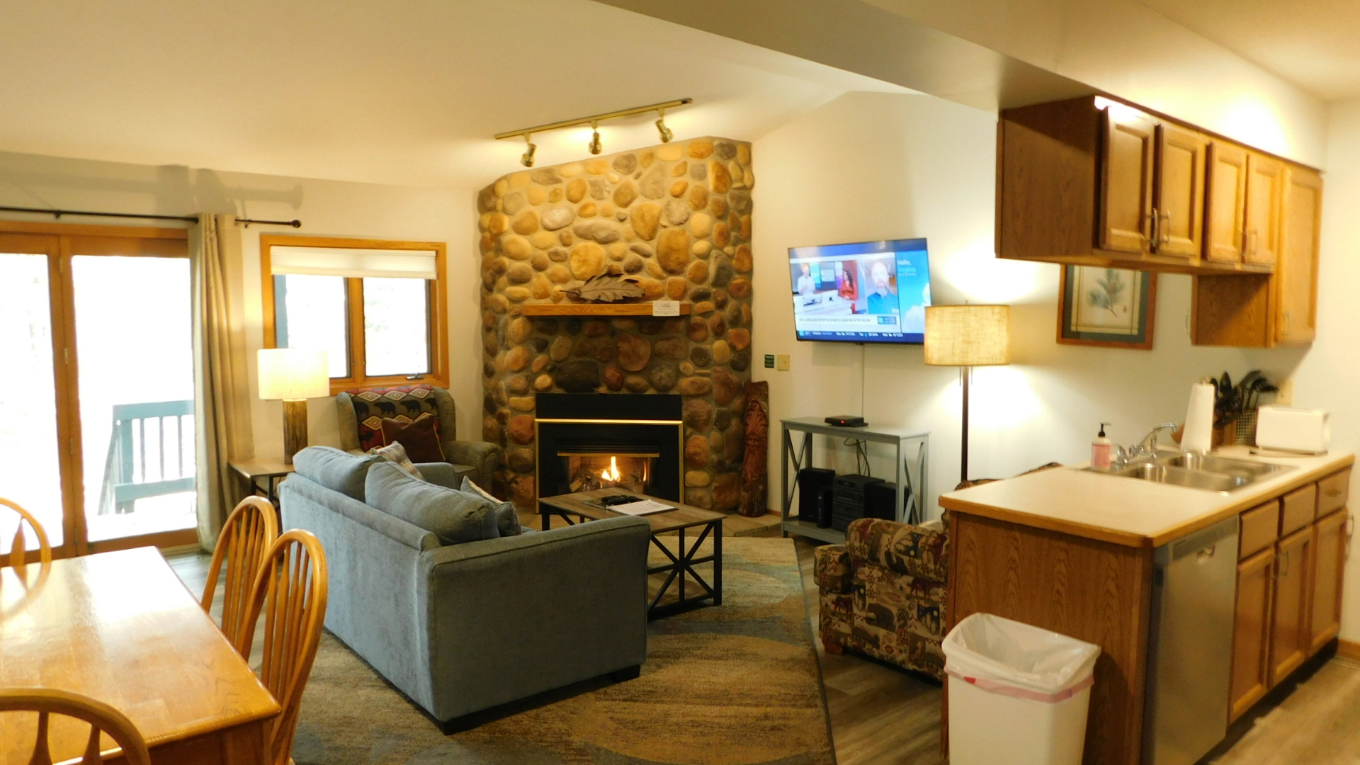 Suite includes a fully equipped kitchen, dining area, living room with fireplace, and queen sofa sleeper; one bedroom with a king or queen size bed. One bath with single whirlpool tub plus washer and dryer. (A couple of units have a walk-in shower instead; please call if you have a specific request.)